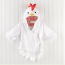 "Barnyard Bathtime" Chicken Hooded Spa Robe. Whoever gets a visit from this eggs-traordinary chick is one clucky newborn! Talk about taking a little one under your wing! Baby Aspen's chicken spa robe is making a big splash during every barnyard bathtime! Features and facts: White spa robe with attached ties, flappy, 3-D wings, embroidered orange beak and black eyes, and a crimson, 3D "comb" on top. Machine-washable terrycloth. Size 0-9 months.