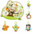 A mirror and sounds on the mat surface add to the fun! MIRROR APPLE has baby-safe mirror and tuggable stem. CHIMING OWL with felt-ruffled tummy for tactile play. RATTLE BIRDIE with see-through rattle and crinkle wings. NUTTY SQUIRREL squeaker is soft and cuddly. SINGING BIRDIE with wooden teether and crinkle wings plays sweet sounds.